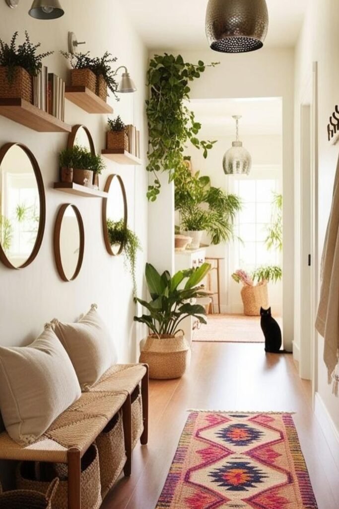 Choosing natural tones for baskets and rugs gives the area calm warmth, making the plants stand out clearly and improving the whole hallway’s welcoming energy.