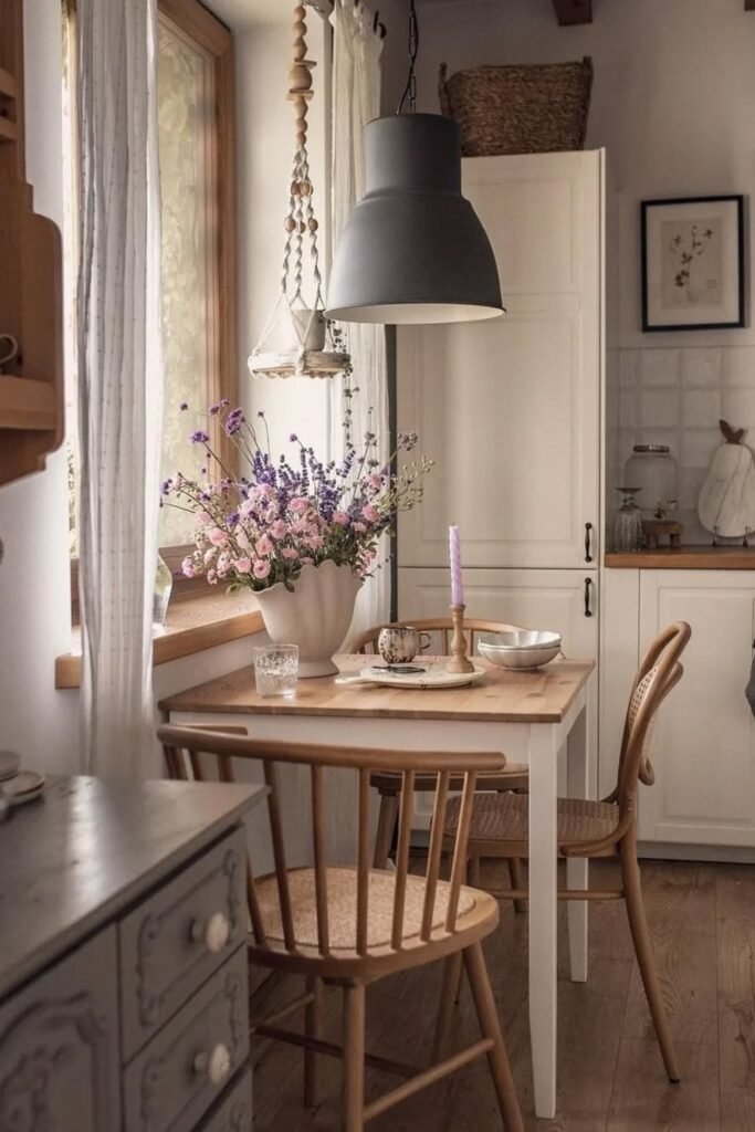 Fresh florals near daylight strengthen mood in small dining corners that feel dull or lack personality during quiet morning routines.