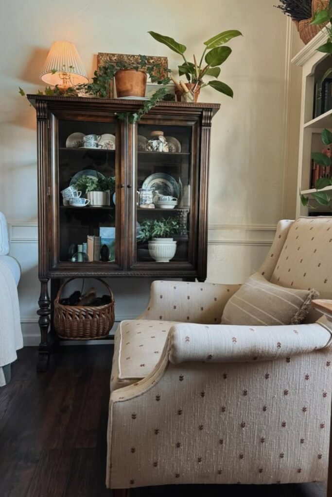 Centering vintage dishes inside the cabinet builds quiet charm, especially when you add soft plants that introduce gentle contrast against darker wood.