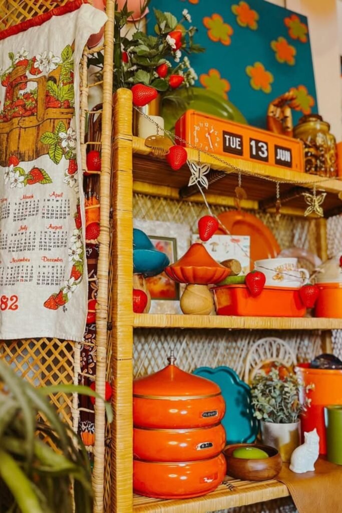 Choosing warm tones, textured baskets, and quirky shapes ties everything nicely, keeping the shelf fun while making the entire retro theme feel naturally intentional.