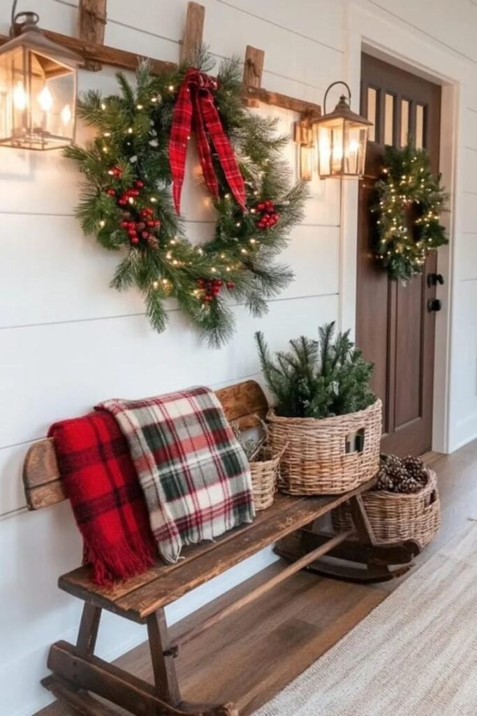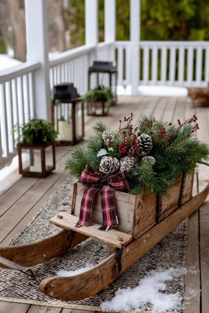 Placing greenery inside an old wooden sled transforms your porch instantly, giving visitors a charming welcome with seasonal color and rustic winter texture.