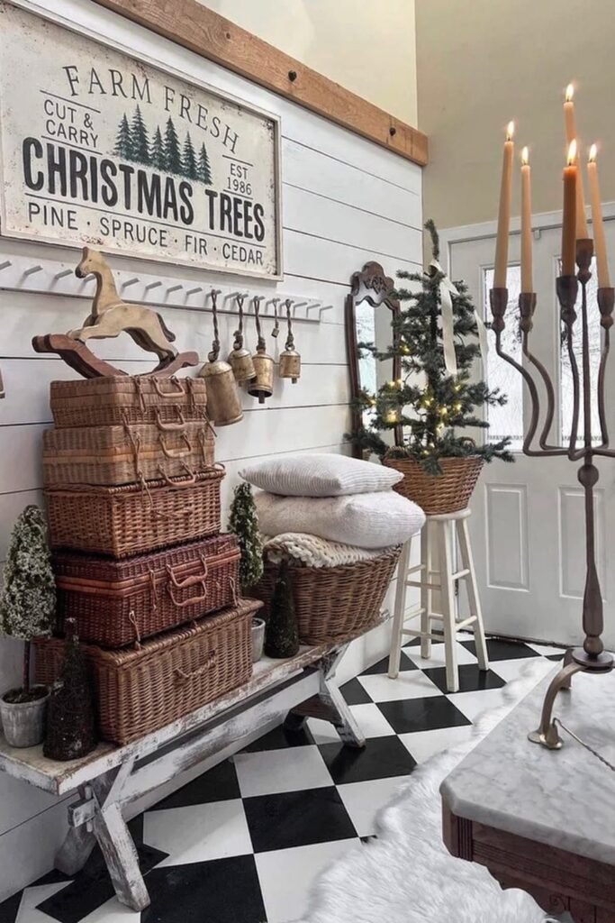 Stacking woven trunks adds purposeful height that fills awkward entry gaps while providing hidden storage for blankets, décor, or winter accessories.