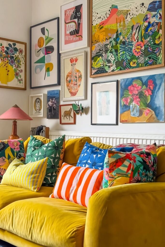 Keep frame sizes varied so the gallery feels spontaneous, giving the room a creative atmosphere perfect for expressive, art-driven styling moments.