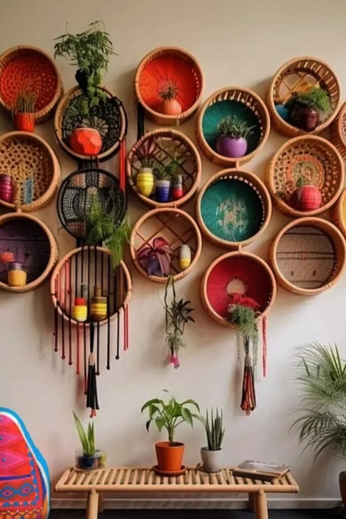 Bright basket shelves transform a plain wall into a playful display that blends handmade texture with small plants for cheerful personality.