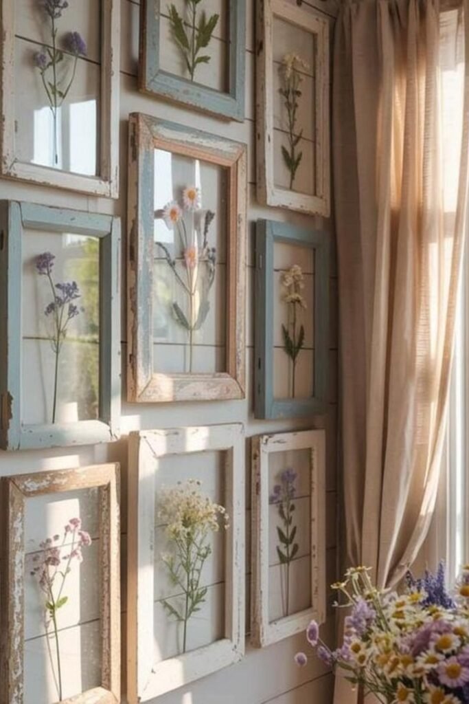 Vintage windows become delicate art pieces when dried blooms are arranged behind glass to capture soft sunlight beautifully every afternoon.