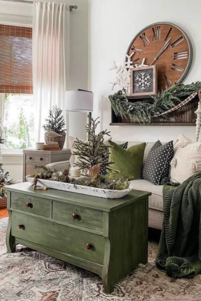 Balance small trees with textured pillows, allowing repeated forest tones to connect separate corners and create a unified, calming holiday atmosphere effortlessly.