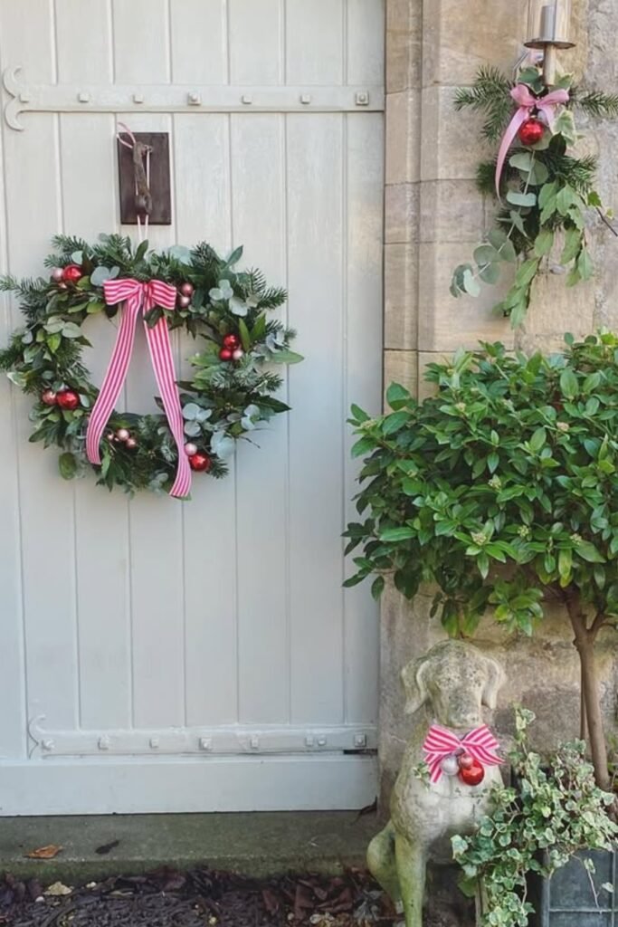Add a simple wreath overhead, allowing repeating red accents to tie the entire porch together and guide the eye along the wall.