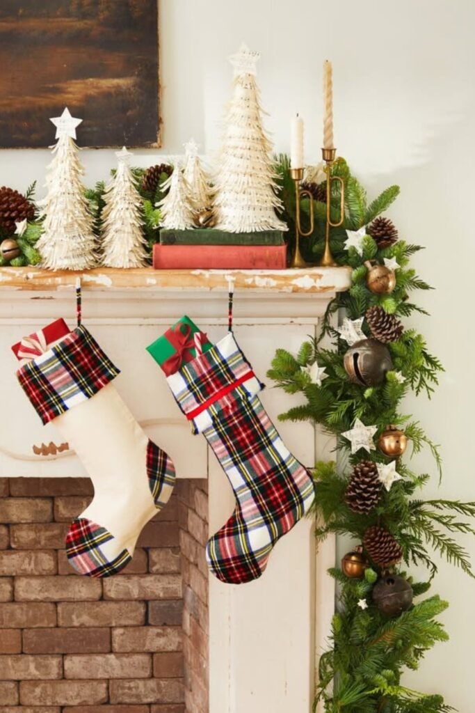 Plaid stockings introduce classic charm along a mantel that needs color contrast and soft texture without heavy decorative elements overwhelming the space.