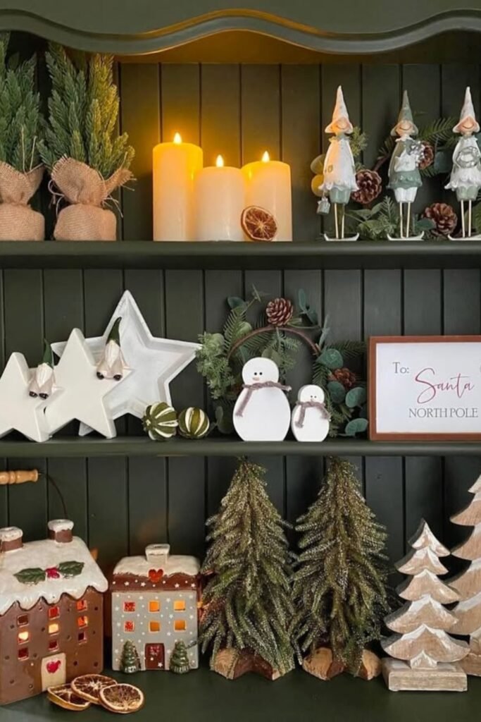 Ceramic figures and small wreaths help shelves gain defined structure, supporting homes needing organized decoration rather than scattered holiday pieces.