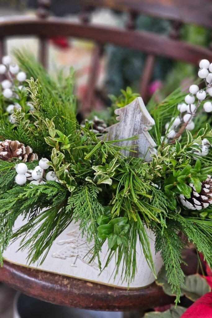 A dense mix of evergreens suits entry consoles or porch corners seeking fresh texture where simplified Christmas touches feel more natural than bold themes.
