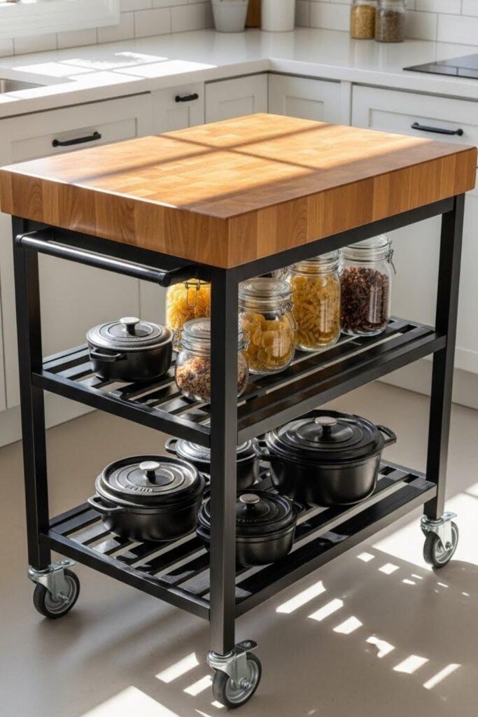 A rolling cart island is ideal for small kitchens that need flexibility. Build a simple frame, add one or two shelves, and install locking caster wheels.