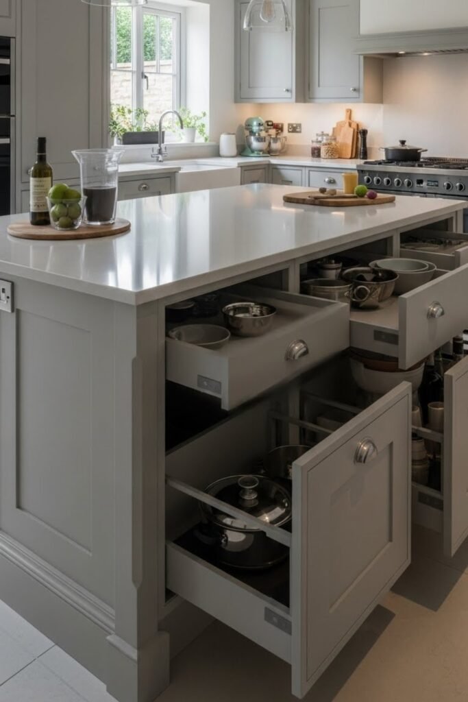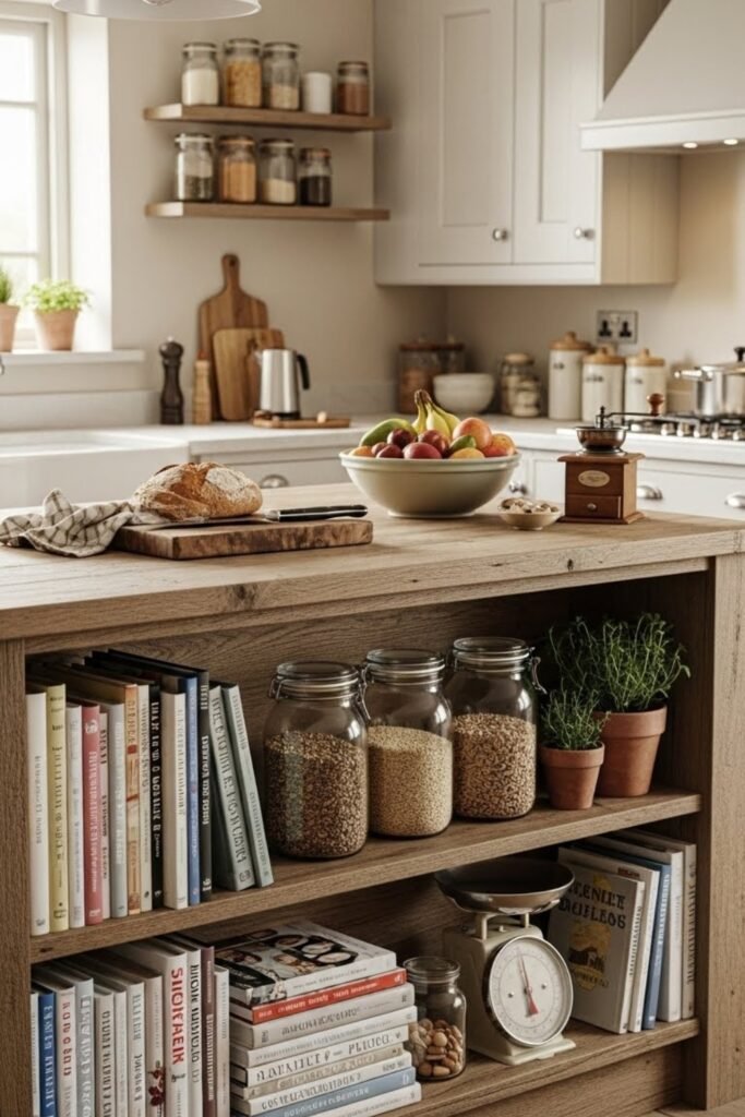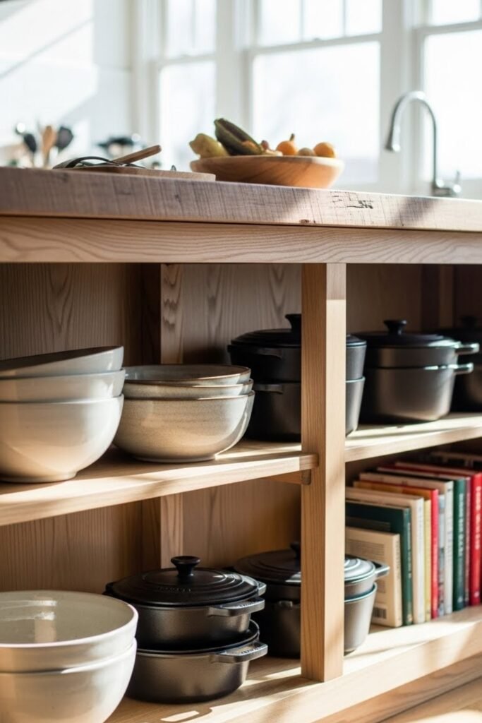 This setup works well for storing bowls, cookware, or baskets. It keeps the island feeling light and is ideal for small kitchens that benefit from an open, uncluttered look.