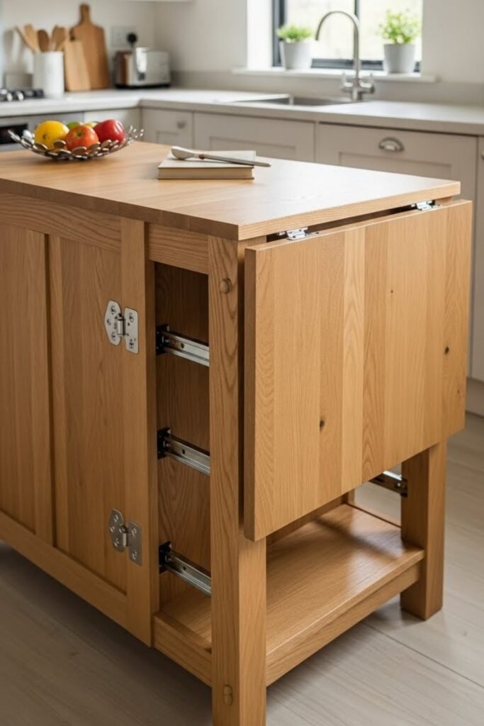 A foldable island is perfect for kitchens that need flexible space. Build a compact base with hinged panels or a folding top that expands when needed.