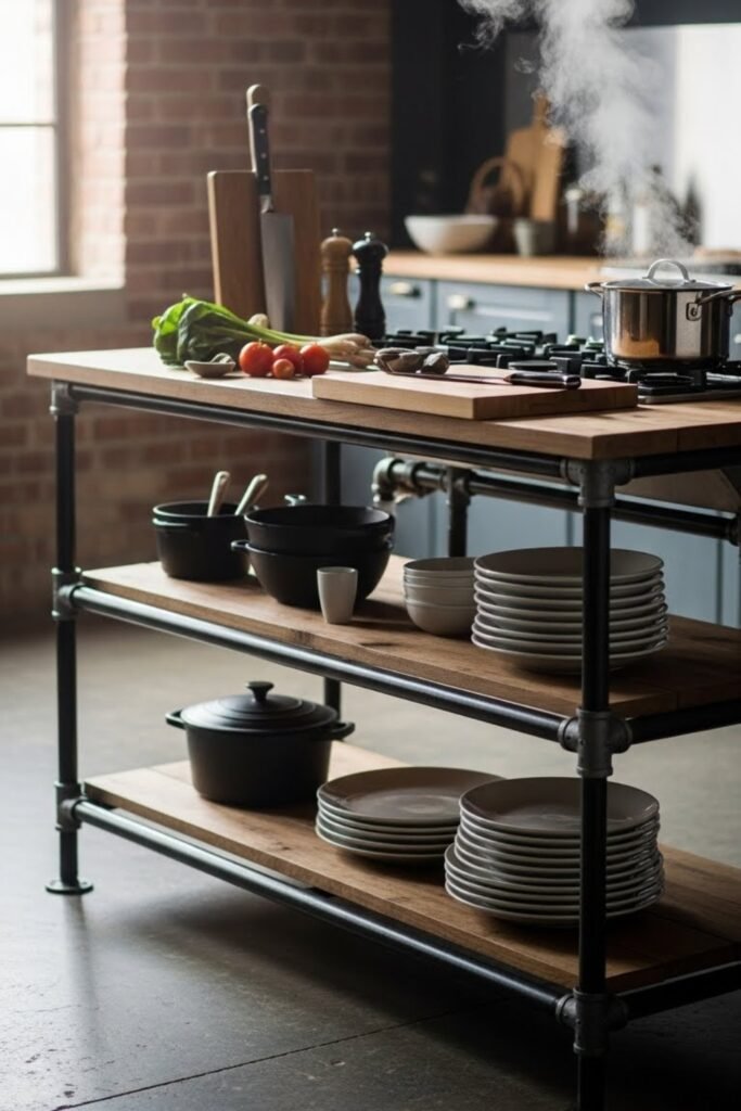 A pipe frame island uses metal pipes to create an industrial-style base. Combine black iron pipes with wooden shelves or a wood countertop for a sturdy structure.