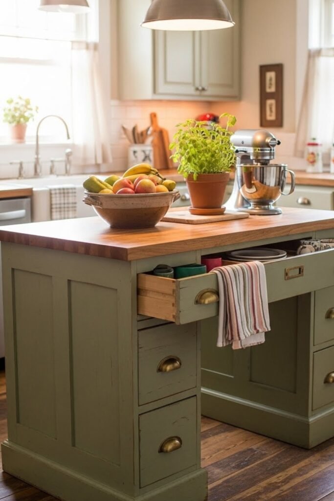 The existing drawers offer storage for utensils or linens. This idea adds character while turning unused furniture into a practical kitchen feature.