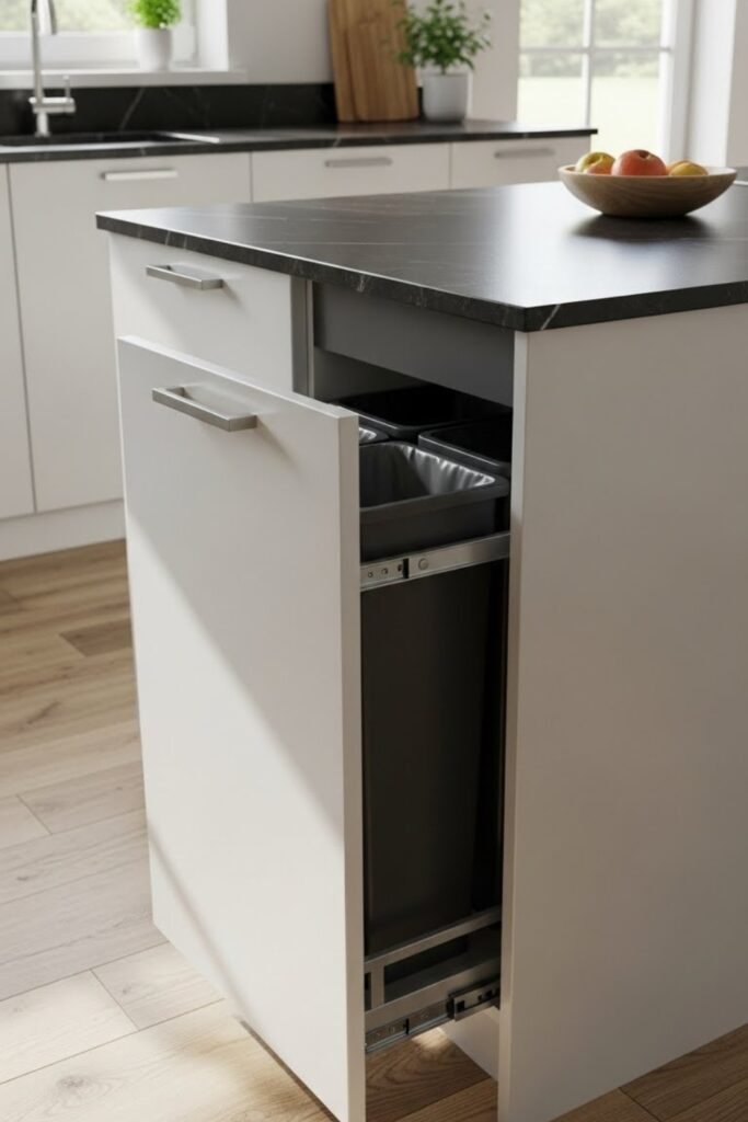 A trash storage island hides waste and recycling inside the base for a cleaner kitchen look. Build a cabinet-style frame and install pull-out bins on sliding tracks.