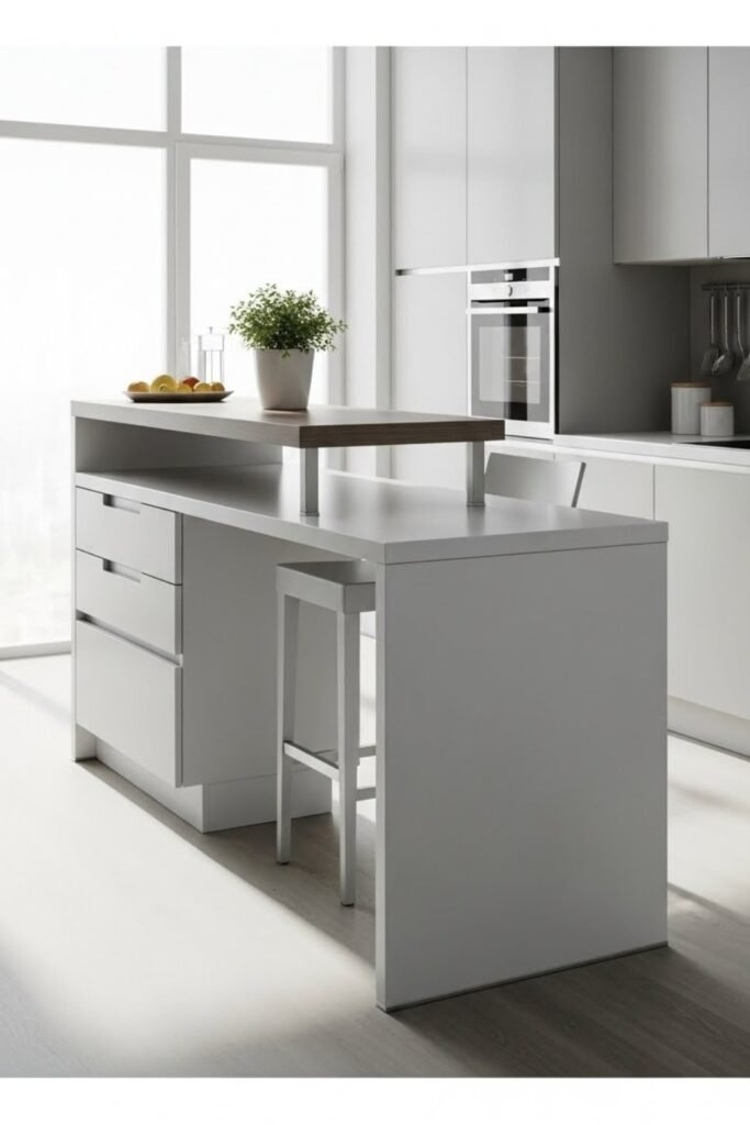 Add bar stools underneath for quick meals or coffee breaks. This design works especially well in open kitchens and helps replace the need for a separate dining table.