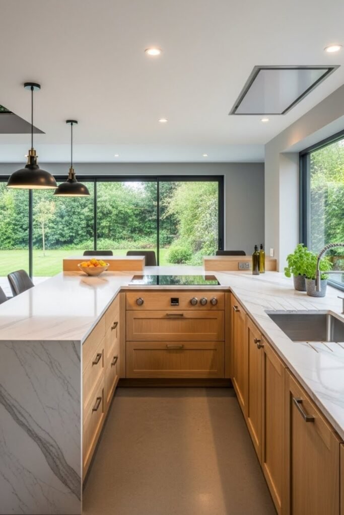 This layout works well for separating prep and seating areas. It’s ideal for larger kitchens that need better flow and more usable workspace.