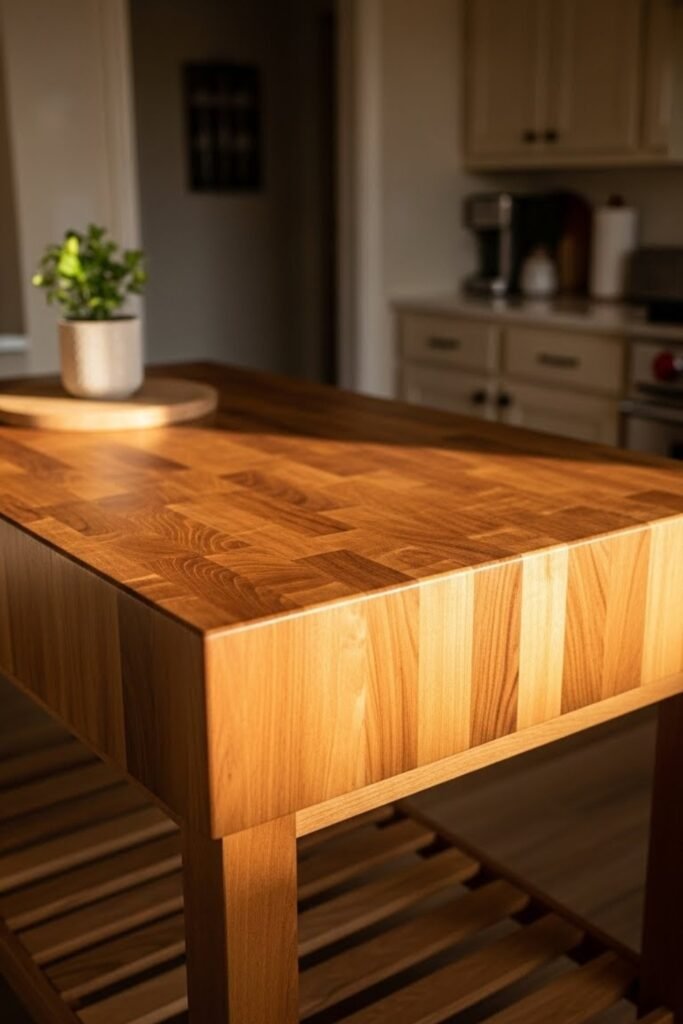 A butcher block island gives you a durable and practical prep surface. Create a basic base using cabinets or a wooden frame, then secure a thick butcher block top.