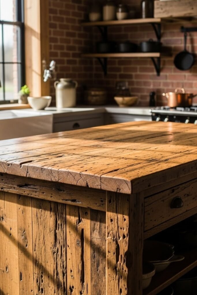 A reclaimed wood island brings warmth and character to the kitchen. Use salvaged wood for the base, countertop, or both.