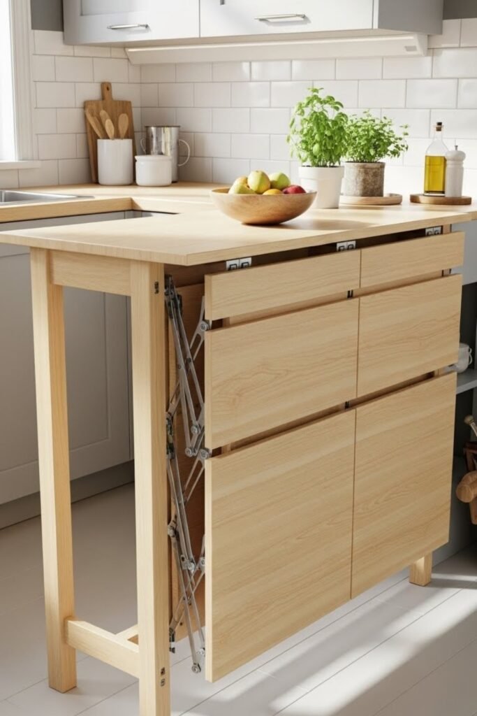 When opened, it provides extra prep or dining space. This design gives you flexibility without taking up permanent room, making it ideal for apartments or narrow layouts.