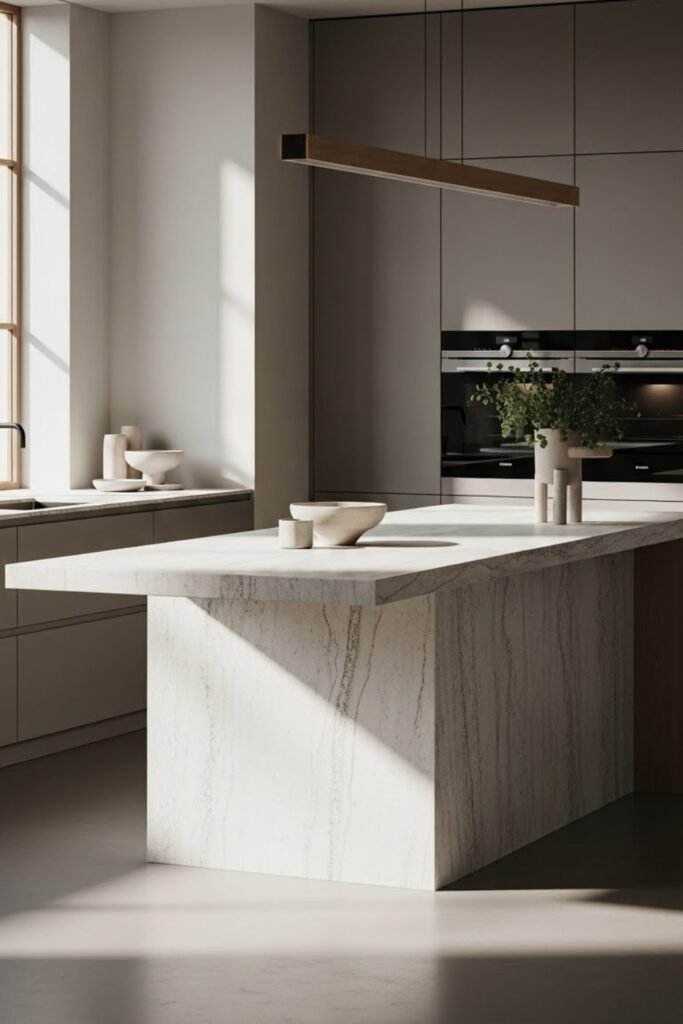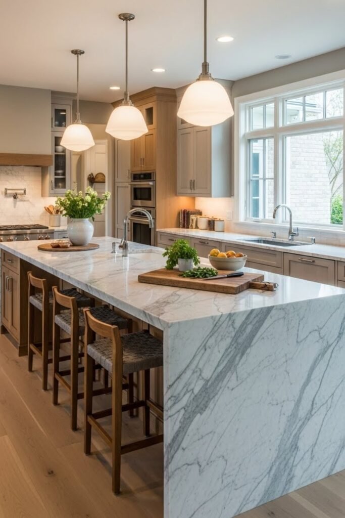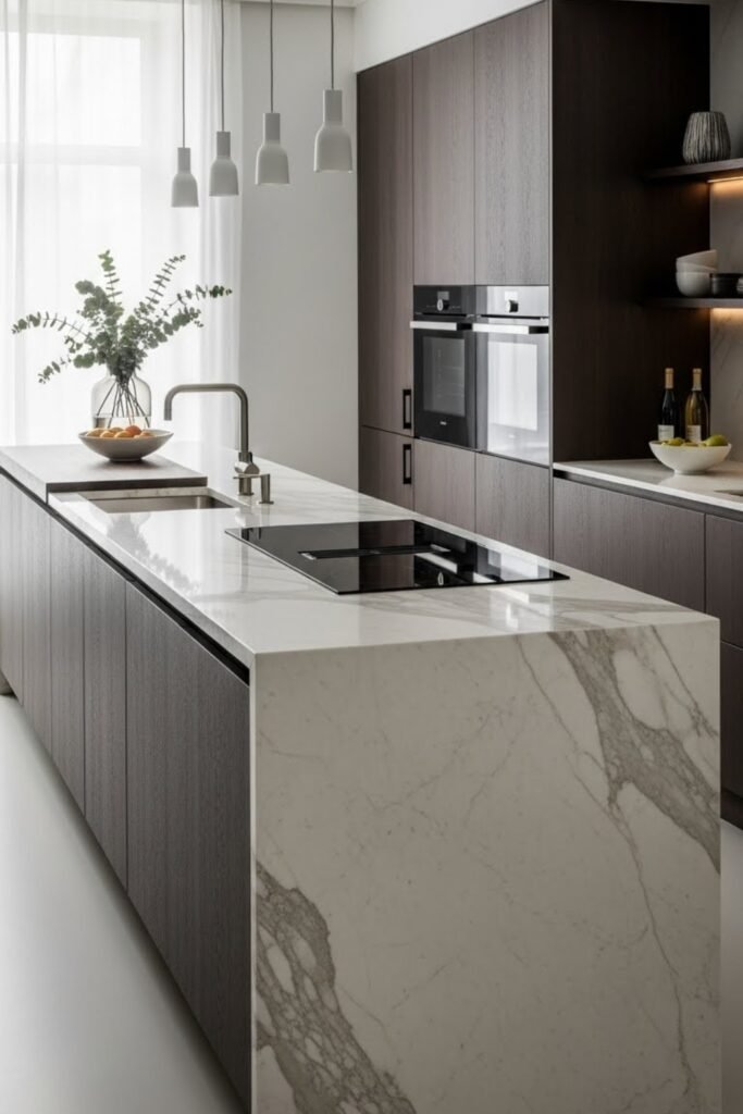 A waterfall edge island creates a sleek, high-end look using a continuous countertop that flows down the sides. Build a solid base, then extend the countertop material over both ends.