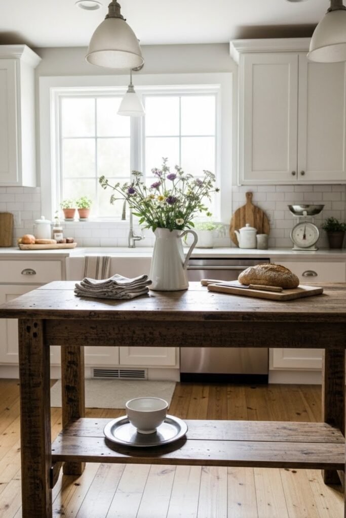 A farmhouse table island repurposes a sturdy table into a functional kitchen feature. Strengthen the legs if needed and add a lower shelf or drawers for storage.