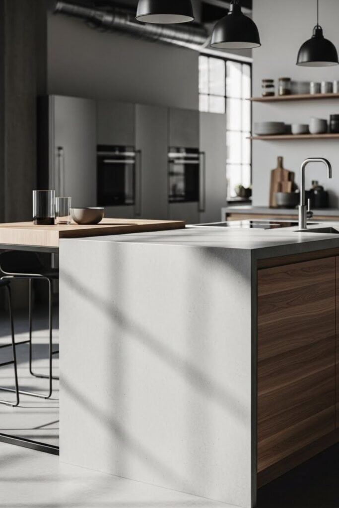 This style works well with wood, stone, or laminate and instantly elevates the kitchen. It’s best for modern spaces where clean lines and bold surfaces stand out.