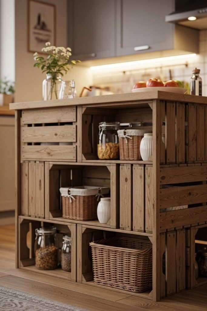 The open crate sides are perfect for storing baskets, produce, or cookbooks. This design works best in casual or rustic kitchens and is easy to customize with paint or stain.