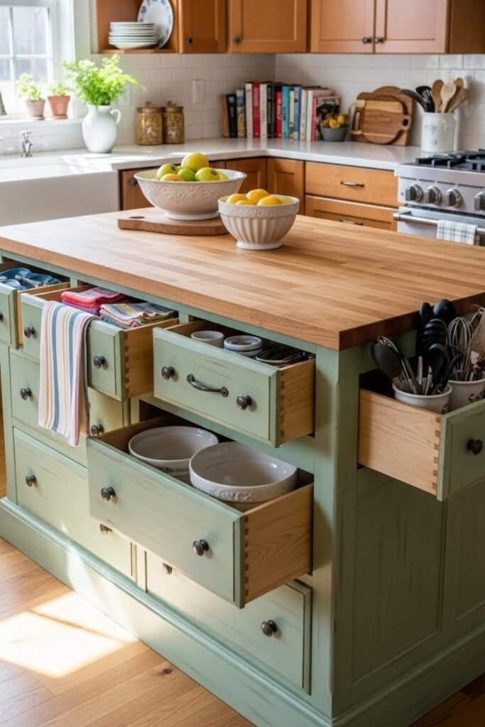 A dresser island repurposes an old dresser into a functional kitchen piece. Remove or adjust drawers as needed, then add a durable countertop.