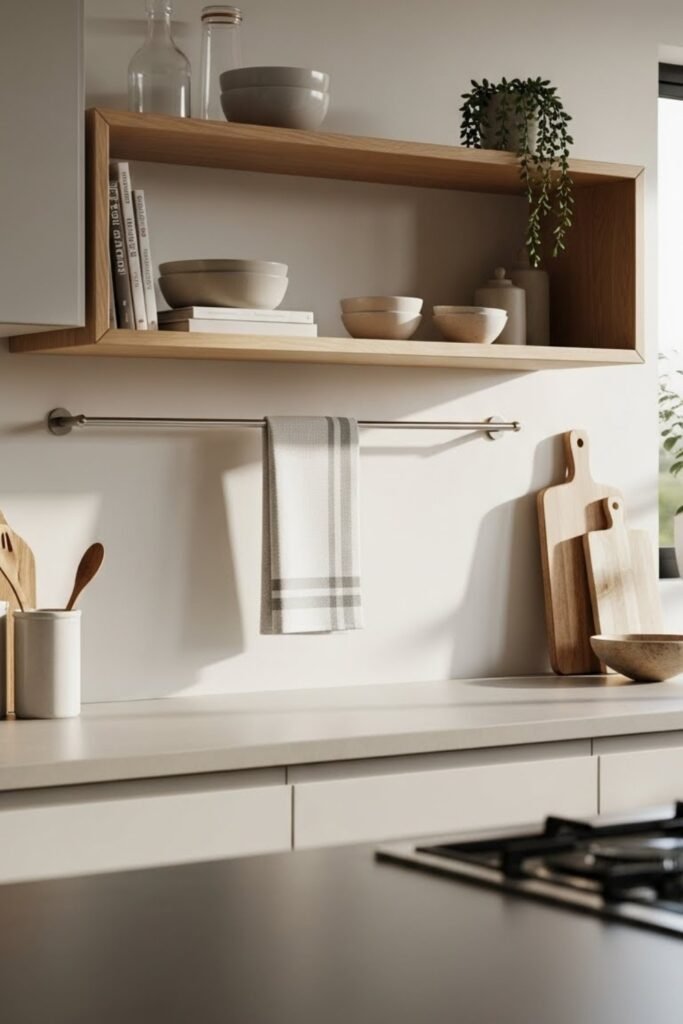 This idea works especially well near sinks or prep corners and helps maintain a clean, uncluttered look in smaller kitchens.
