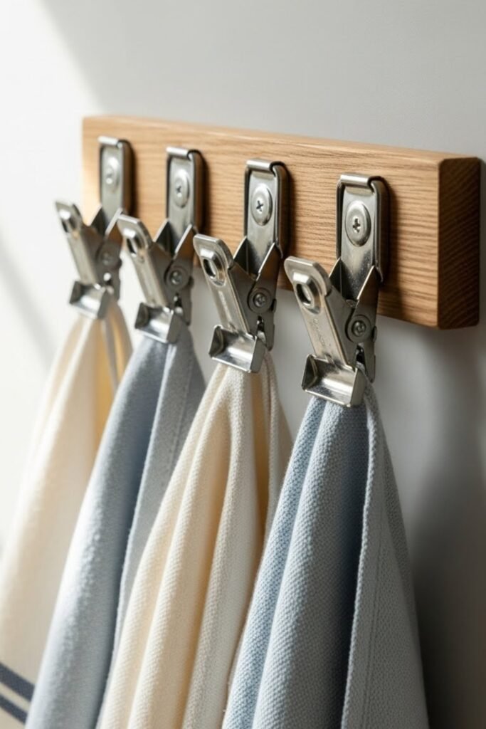 Use sturdy clips attached to a wooden strip or metal bar to hold towels securely. This setup makes it easy to swap towels quickly and keeps them fully visible for faster drying.