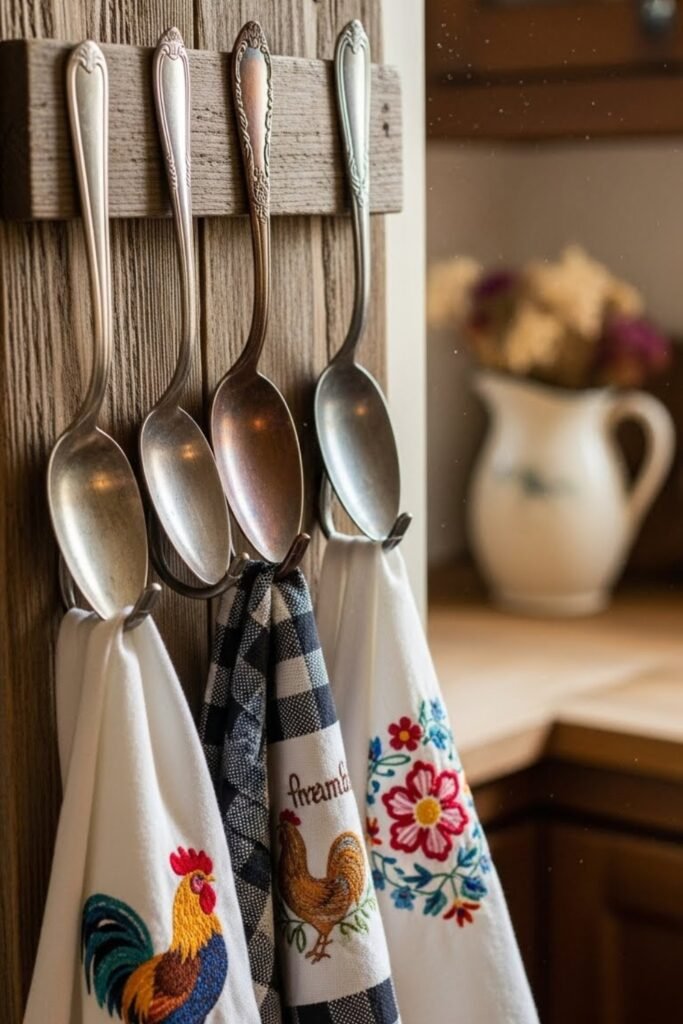 Old metal or wooden spoons can be bent into hooks and mounted on a board or directly on the wall. This creates a playful and vintage-style towel holder with lots of character.