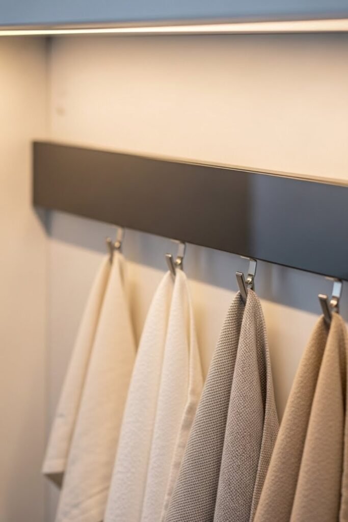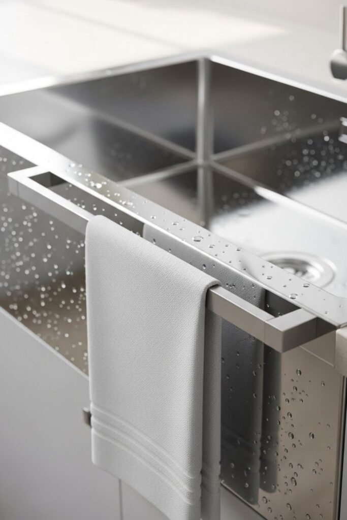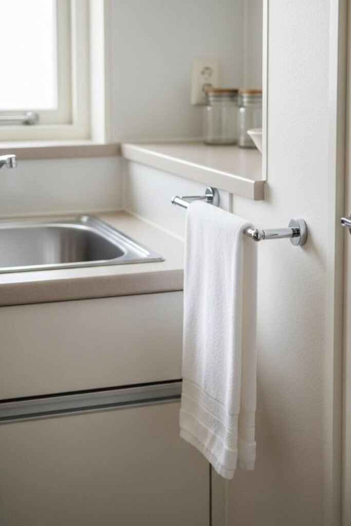 Turn the inside or outside of a cabinet door into a smart towel storage spot using a slim metal rod. This keeps towels hidden but easy to grab while cooking or cleaning.