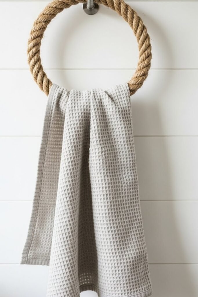 A thick rope loop secured to the wall creates a casual, coastal-inspired towel holder. It’s easy to install and adds texture without feeling heavy.