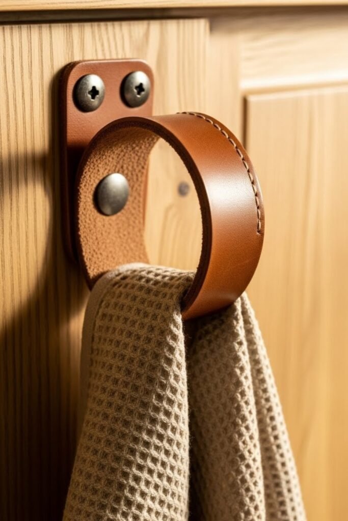 Leather straps add warmth and texture while holding kitchen towels stylishly. Secure one or two leather loops to the wall, cabinet side, or island using screws or rivets.