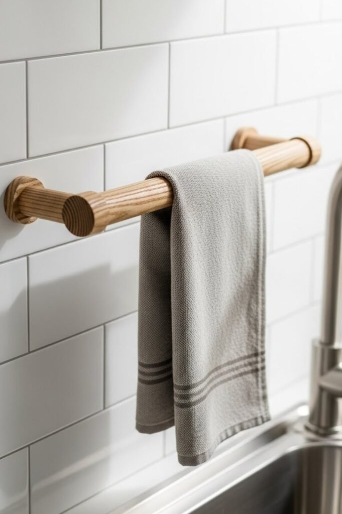 A simple wooden dowel makes a clean and budget-friendly towel holder for any kitchen. Mount it on the wall, between cabinets, or near the sink using basic brackets or leather loops.