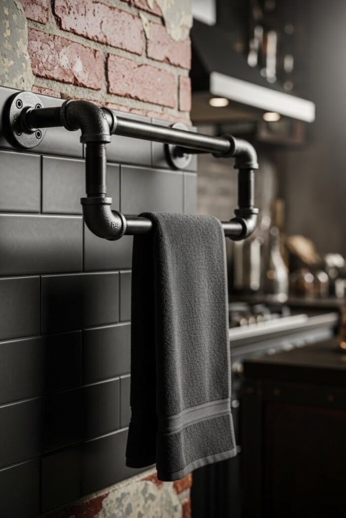 Industrial-style pipes can be assembled into a sturdy towel bar using basic fittings. Mount it on the wall or kitchen island for a bold, functional look.