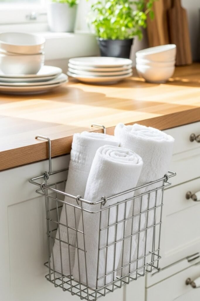Roll or fold towels and tuck them inside for a neat, casual look. This idea works well in cozy kitchens and adds a bit of texture while keeping towels within easy reach.