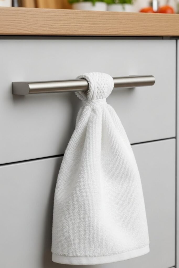 Attach a towel directly to a drawer or cabinet handle using a loop, clip, or snap. This keeps towels exactly where you work most and requires no extra hardware.