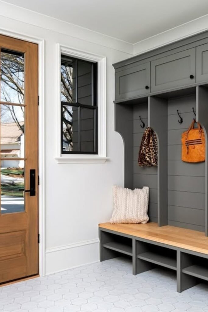 This approach suits farmhouse or cottage entries needing durable finishes that still feel soft and welcoming daily use.