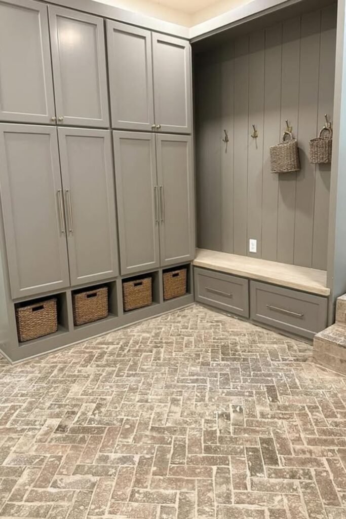 Perfect for modern mudrooms where texture matters and storage needs stay intentionally minimal yet functional for daily routines.