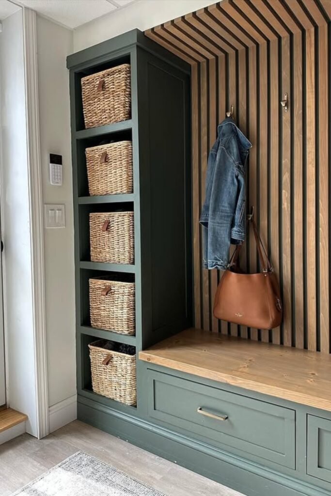 Frame simple cubbies below, size baskets evenly, and top everything with a stained wood seat for warmth contrast.