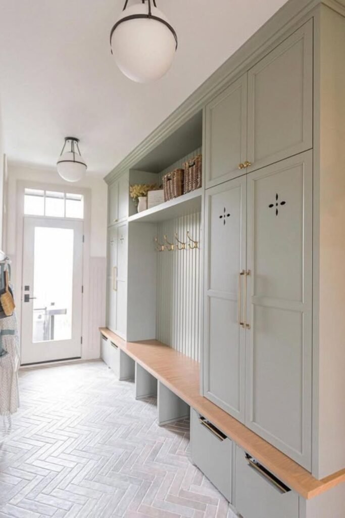 A long bench paired with tall cabinets maximizes storage along narrow mudroom hallways without making the space feel cramped.
