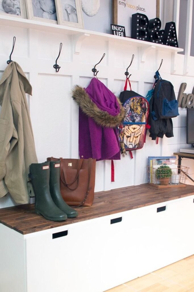 Attach wood slats over plywood, secure hooks through studs, then install a deep drawer bench below for storage.