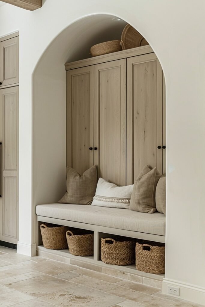 An arched wall niche turns unused architectural space into a functional bench without stealing extra floor area in entryways.