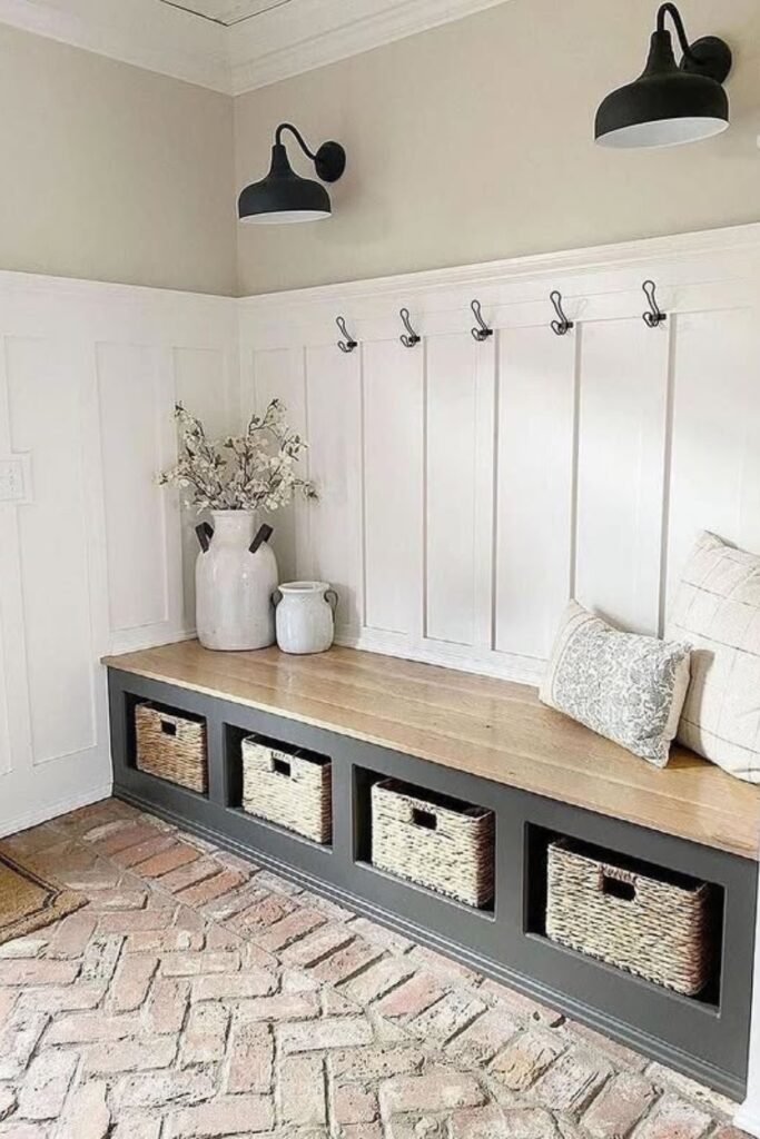 Wainscoting behind the bench protects walls from scuffs while adding subtle architectural texture to busy entryway seating zones.