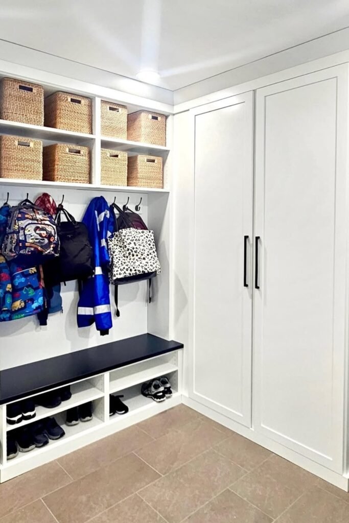 Perfect for homes lacking a true mudroom but needing consistent storage along limited wall space.