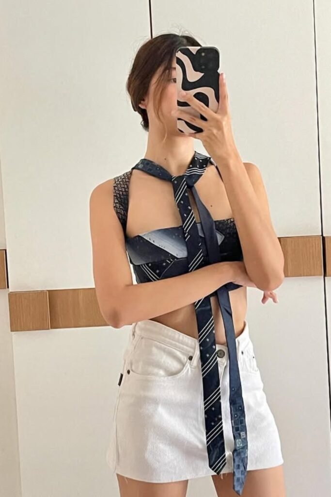 This daring, stylish DIY turns old ties into a trendy halter top. It mixes style and originality, making it great for summer festivals or edgy streetwear.