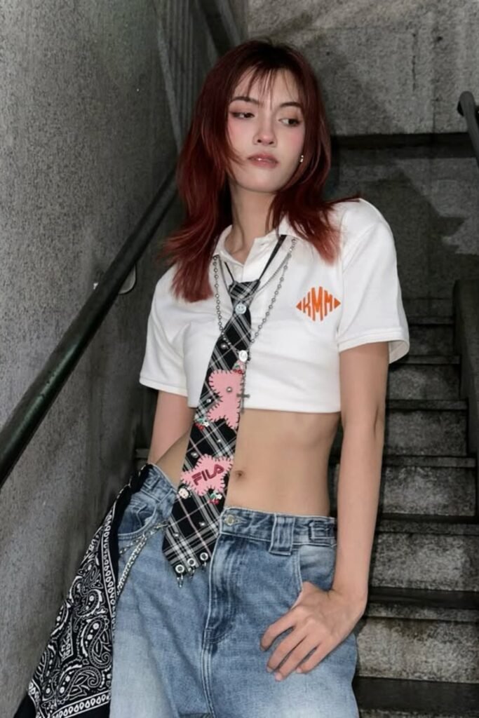 This is great for Y2K or punk-inspired ensembles. Just put a patterned tie over a cropped tee and add pins, charms, or safety clips to make it your own.